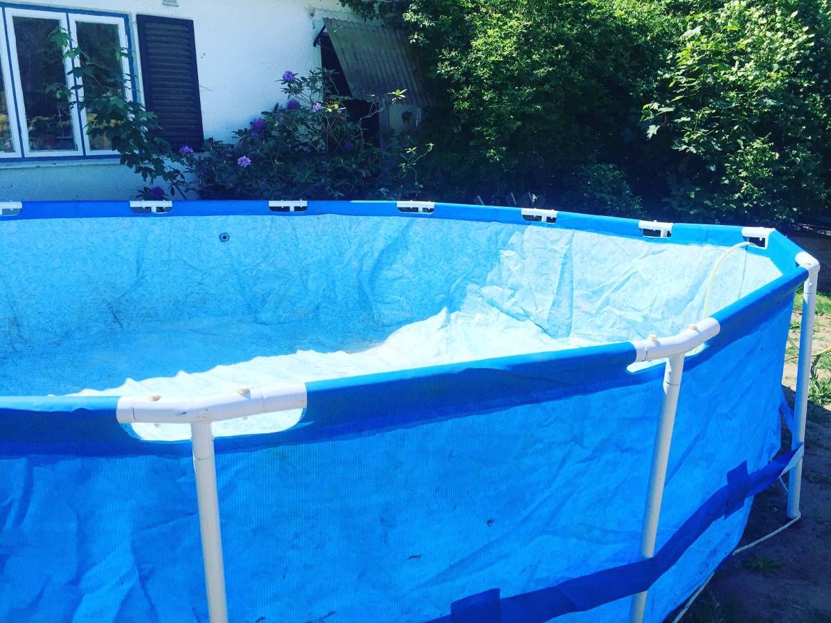 När vi kom hem hade Kalle börjat sätta upp poolen vi fick av de danska grannarna och jäklar vad stor den är! Helt galet. Den står utanför köksfönstret och det är inte så kul att se ut på men bra att kunna ha koll på barnen. Hela den sidan ser tråkig ut just nu då det mest är en byggarbetsplats så en pool spelade väl ingen roll i dagsläget.