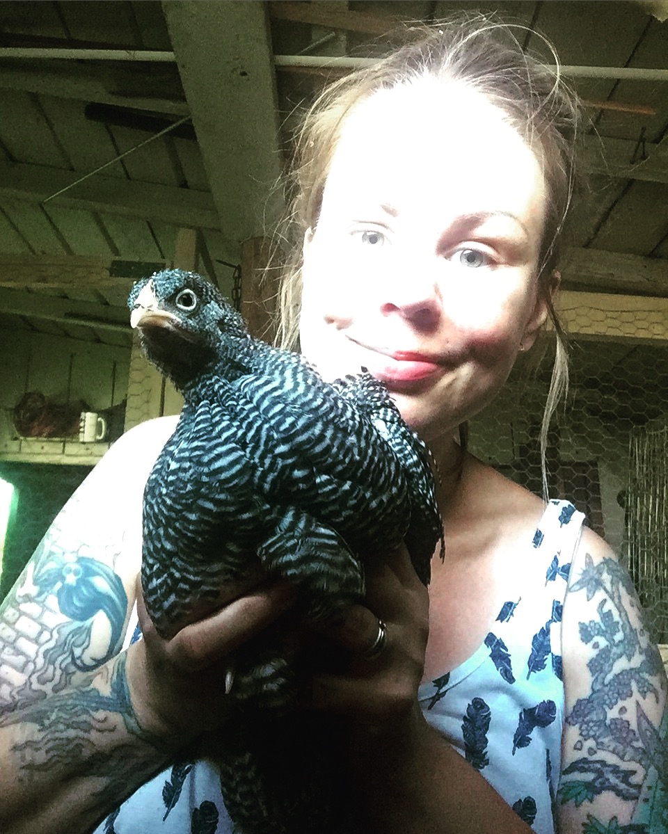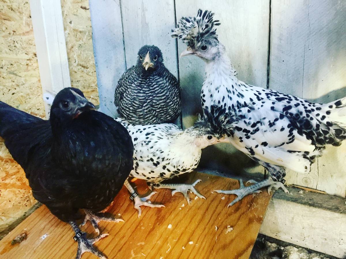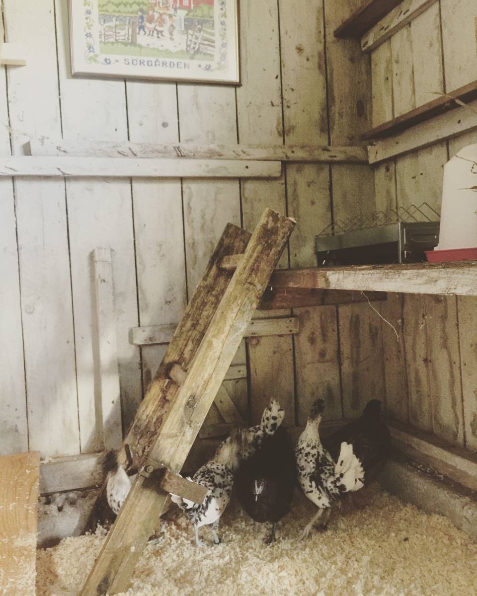 För tre timmar kom jag hem med bilen full av tjejer – sex hönor och en kanin. Två av hönorna ska Emma ha och till mig köpte jag två Appenzeller, en Plymouth Rock och en Svarthöna. De är ganska rädda av sig men jag övar på att hålla på med dem. Ärligt talat så tycker jag att det är läskigt att hålla och ta i dem så det är lite ömsesidiga känslor oss emellan just nu.