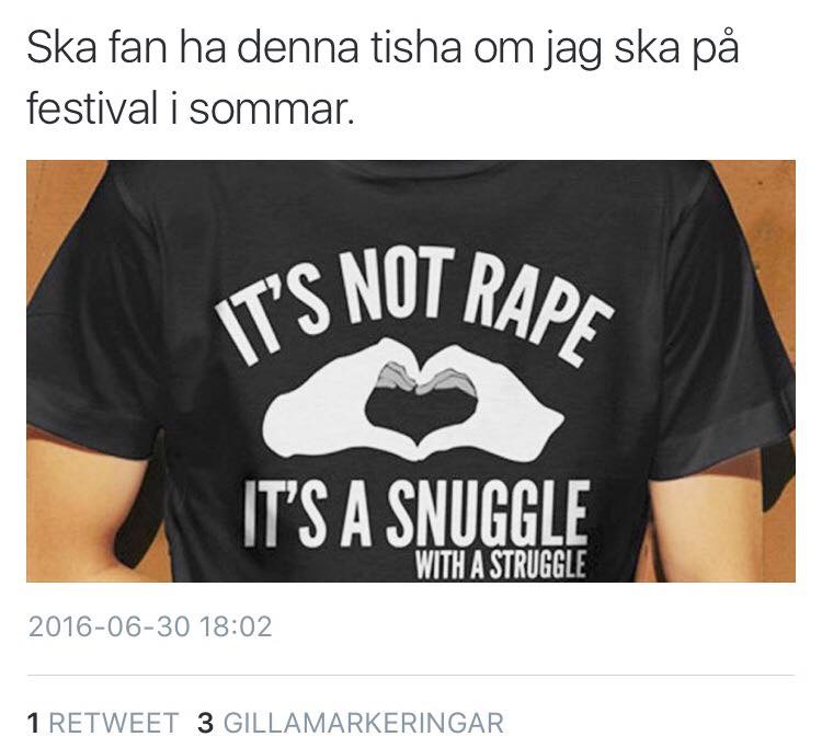 Vidrigt siljesvard Are U kidding me?? 1 juli, 2016 1 minut Det finns alltså män som på allvar vill använda den här tröjan: Fy fan så jävla vidrigt. De som tycker att sånt är humor borde fan spärras in i förebyggande syfte. Dela det här: Dela på X (Öppnas i ett nytt fönster) X Dela på Facebook (Öppnas i ett nytt fönster) Facebook Gilla Laddar in … Relaterade Publicerad av siljesvard Visa alla inlägg av siljesvard Publicerat 1 juli, 2016