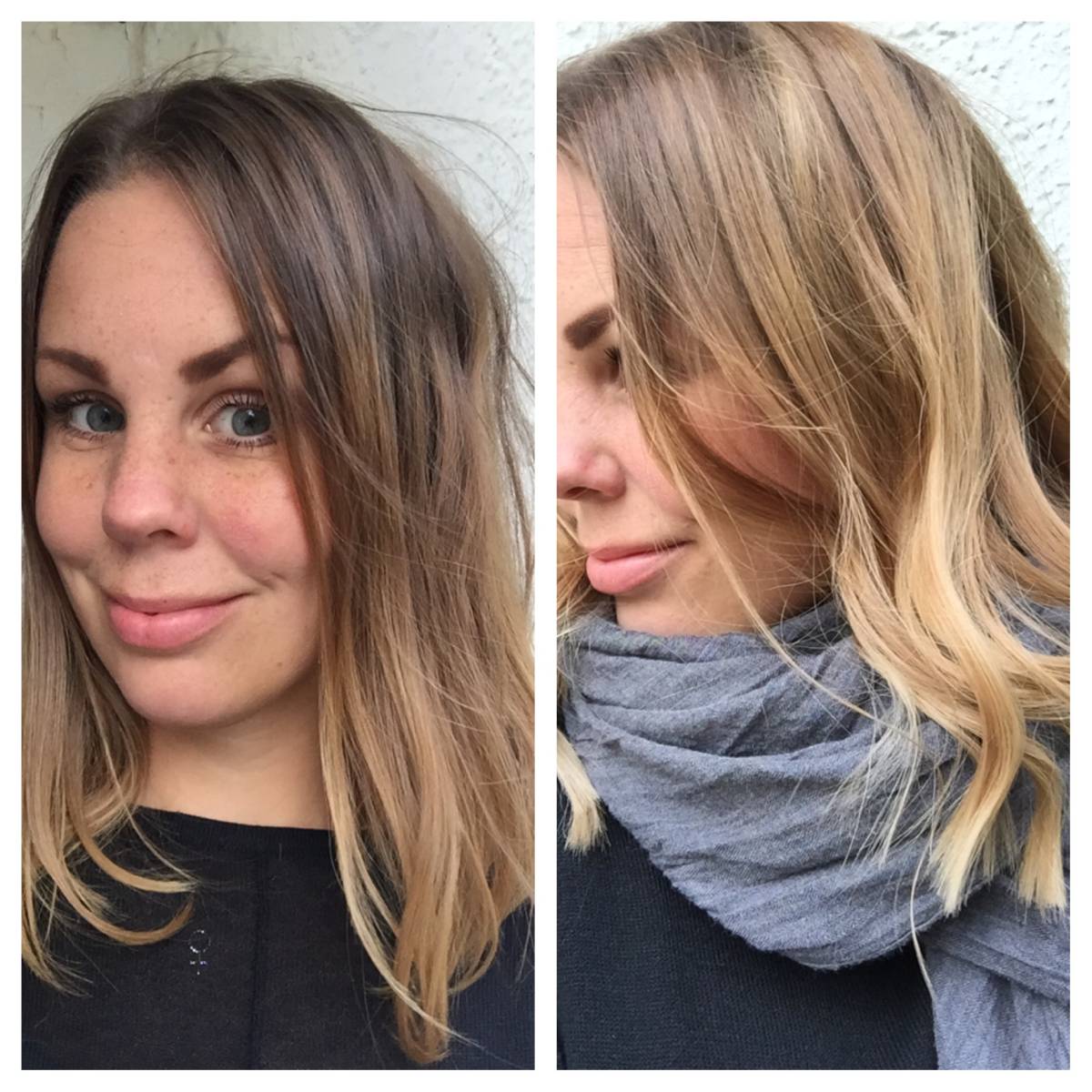 Idag ”målade” hon mitt hår (baylage) på frihand för att ljusa upp det på ett naturligt sätt. Hon lämnade botten i min egen färg för att slippa utväxt men gjorde ljuda slingor fram för att rama in ansiktet. Jag gjorde en Olaplex-behandling för att skona håret och la i en toning för att få håret åt det kallare hållet och nästa gång ljusar vi upp det ytterligare ett steg.