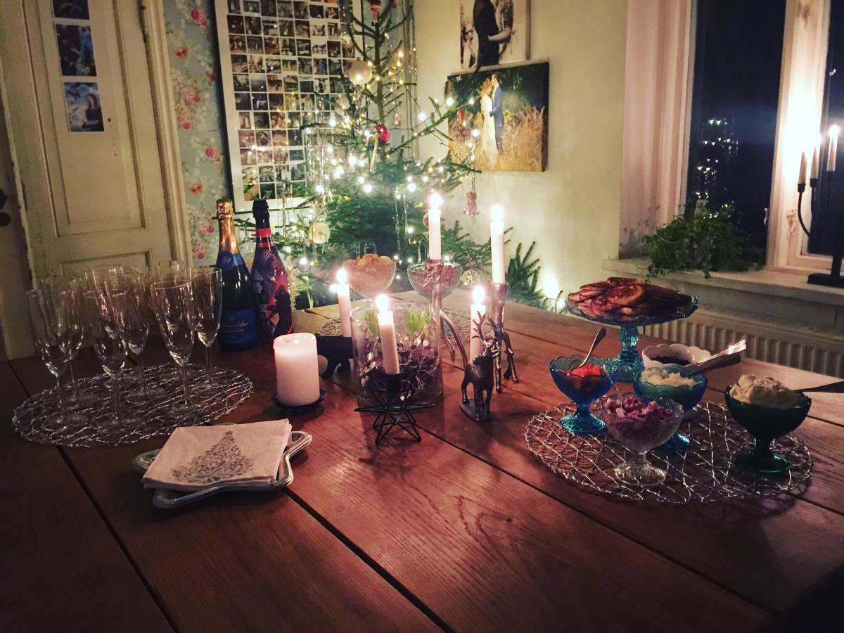 Middag med grannarna ikväll alltså. De kom hit klockan fem och vi drack bubbel och åt lite mingelmat, löjromsblinier med vispad créme fraiche, svart och röd caviar och röd och gul lök. Vi hade förberett en rådjurssadel och när den var klar gick vi över till grannarna och de hade gjort hasselbackspotatis och rödvinssås. Så gott det blev! Riktig lyxmat. Vi åt mandelmusslor och julgodis efteråt och vid 23 var vi helt slut och avrundade kvällen. Kalle som gick upp skittidigt och jagade somnade direkt i soffan och vi andra kollar som sagt Historieätarna.