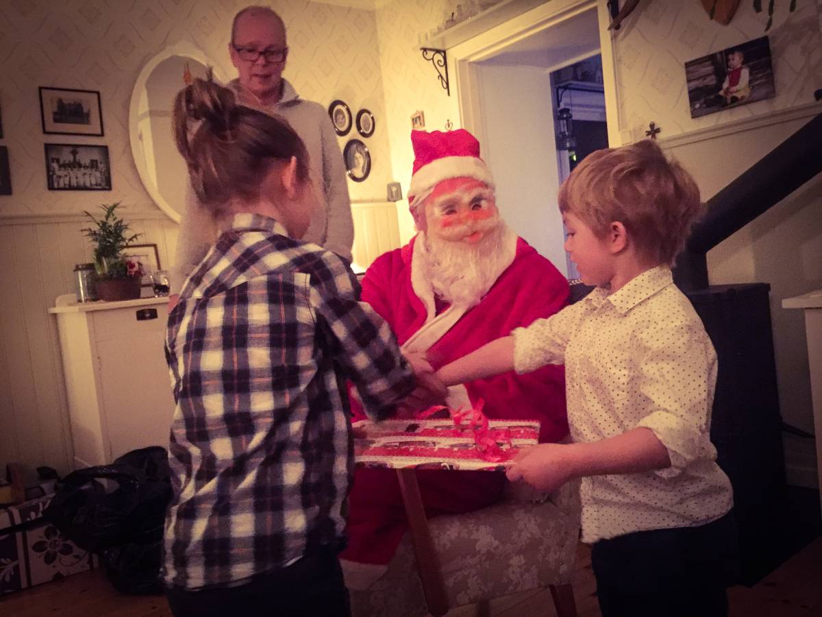 Nör vi röjt undan efter maten så kom äntligen tomten och barnen blev så glada. Vi delade ut paket och alla verkade glada med vad de fick. Barnen kammade hem Lego, spel, maskeraddräkter och mycket annat. Jag fick mycket mer än jag trodde och är jätteglad för mina julklappar.