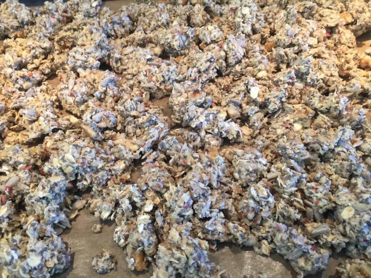 Blanda vatten, olja, honung och saffran i en liten kastrull så att det blir ljummet (värm på låg värme). Häll vätskan över de torra ingredienserna och blanda samman till en deg. Klicka ut degen på en plåt som ställs in i ugnen på 200 grader i 20-25 minuter. Rör om 2-3 gånger under gräddningstiden. Passa på slutet så att det inte bränns vid. Låt granolan svalna på plåten.